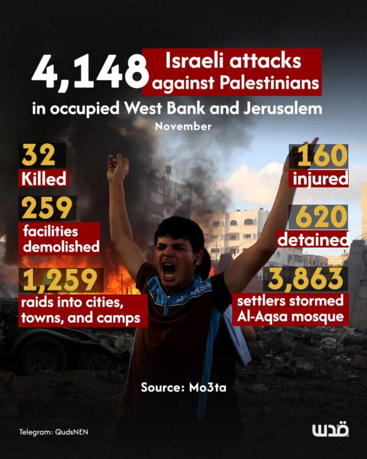 Cisgiordania. Il Centro di informazione palestinese ha rilasciato una dichiarazione sul numero di attacchi dell’occupazione israeliana commessi contro i palestinesi e le loro proprietà nella Cisgiordania occupata, inclusa Gerusalemme, durante il mese di novembre 2024.