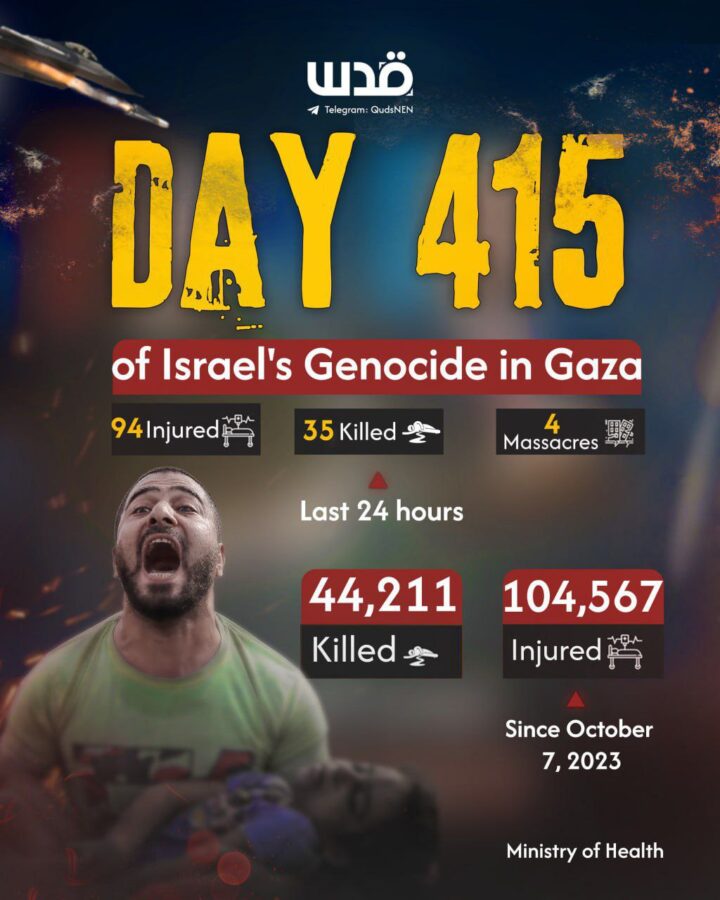InfoPal. L’olocausto gazawi ad opera delle forze coloniali genocide sioniste, armate e sostenute da USA ed Europa, con la complicità del mondo arabo, è entrato domenica nel 415° giorno. La catastrofe umanitaria e sanitaria è totale. Assistiamo impotenti e sconvolti al peggior sterminio post-seconda guerra mondiale, i cui metodi sono un mix letale e superano noti storici genocidi in termini di spazio-tempo. Osserviamo anche il fallimento definitivo delle organizzazioni internazionali come ONU, Tribunali penali e di giustizia, UNICEF, ecc., incapaci di fermare la carneficina dei nativi nella Striscia di Gaza, in Cisgiordania e in Libano ad opera delle forze criminali coloniali israeliane, armate dall’Occidente. Il mainstream ha raggiunto livelli di prostituzione mediatica senza precedenti, mascherando il razzismo israeliano con la solita propaganda a cui nessun essere senziente ormai dà credito.