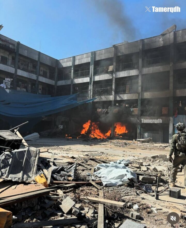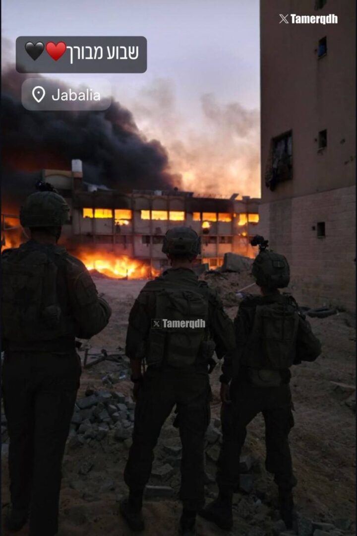 I soldati israeliani hanno pubblicato foto in cui ostentano di aver incendiato le scuole che avevano dato rifugio a decine di famiglie palestinesi sfollate a Jabalia, nella Striscia di Gaza settentrionale.