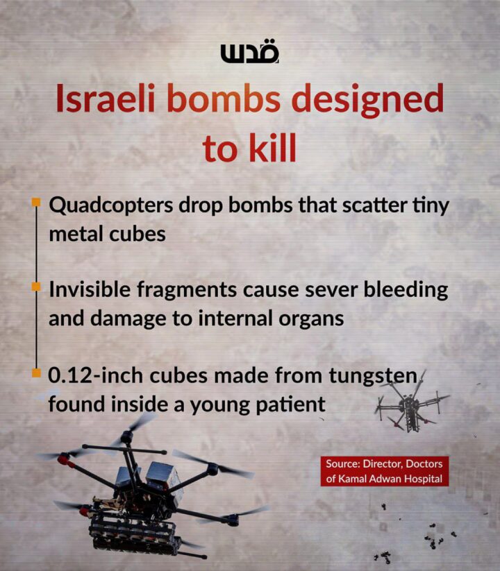 Il direttore dell’ospedale Kamal Adwan, il dott. Hussam Abu Safyia, ha affermato che i droni quadricotteri israeliani hanno sganciato bombe contenenti minuscoli frammenti quasi invisibili a occhio nudo, ma che causano gravi emorragie e danni agli organi interni.