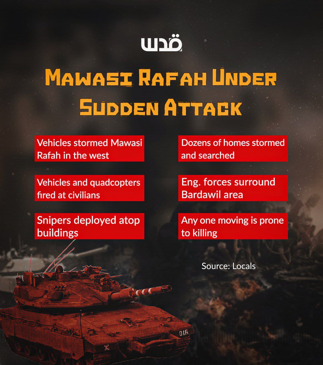 Fonti locali riferiscono che i suoni dei veicoli militari israeliani sono udibili dalla parte occidentale di Rafah, con ulteriori unità corazzate che avanzano verso l’area di al-Bardawil. Insieme a queste forze, unità di ingegneria hanno circondato l’area, portando all’assalto e all’occupazione di diverse case.