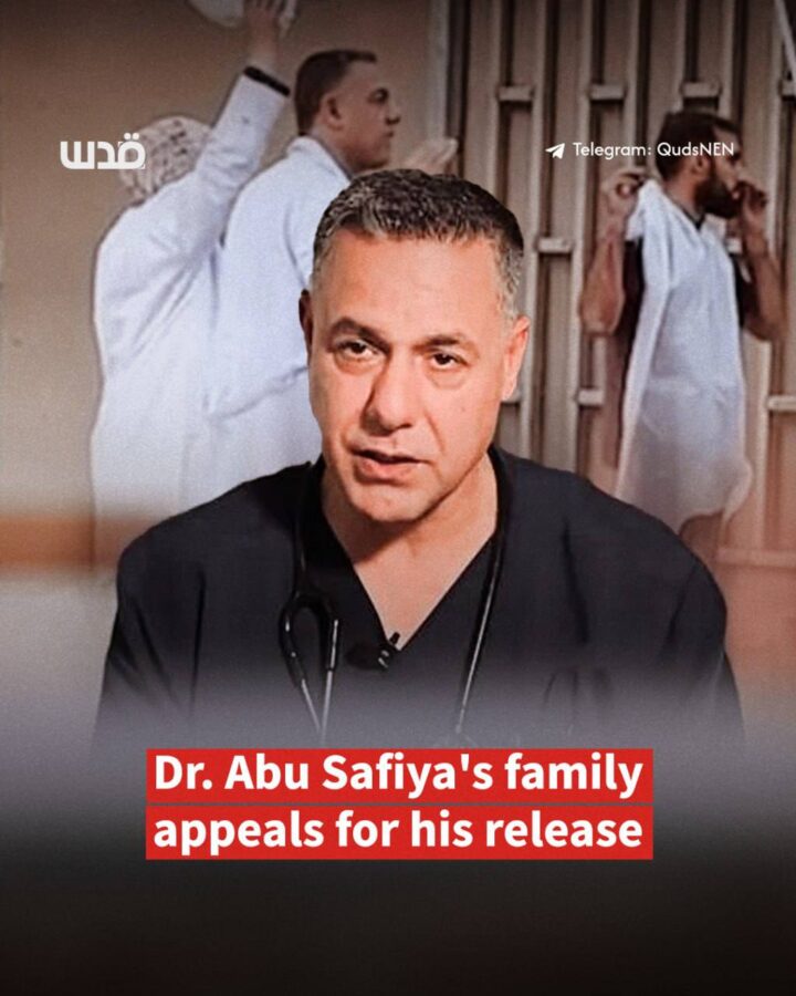 La famiglia del dott. Hussam Abu Safiya, direttore dell’ospedale Kamal Adwan, ha rilasciato una dichiarazione chiedendo l’immediato rilascio del figlio, il cui destino rimane sconosciuto da quando è stato rapito dalle forze di occupazione israeliane.