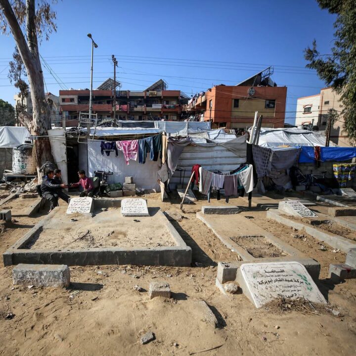 (Foto di copertina: famiglie palestinesi sfollate costrette a vivere in un cimitero a Deir Al Balah, nella zona centrale della Striscia di Gaza, a causa della mancanza di spazio nella città sovraffollata e in seguito alle minacce di bombardamenti diffuse dall’occupazione israeliana fin dall’inizio del genocidio israeliano in corso).