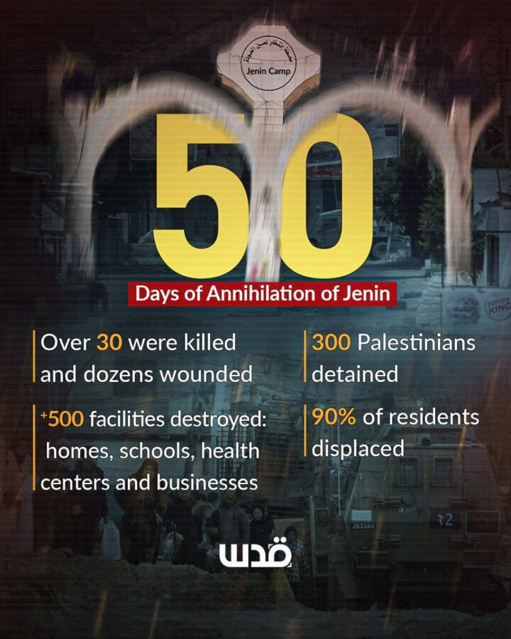 Jenin. L’esercito israeliano ha condotto una campagna intensiva di annientamento contro Jenin per il 50° giorno consecutivo, con incursioni quotidiane e arresti mirati a civili e combattenti palestinesi, oltre alla distruzione delle infrastrutture e alle case del campo.