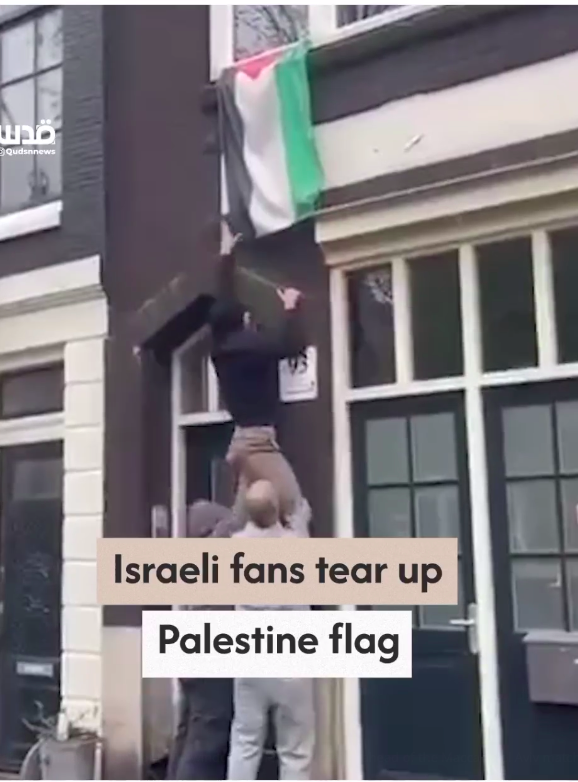 Il video mostra israeliani che strappano una bandiera palestinese appesa a una finestra nella capitale olandese prima della partita del Maccabi Tel Aviv contro l’Ajax.