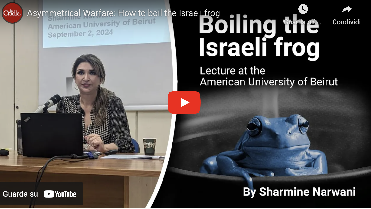 The Cradle. Relatrice, Sharmine Narwani. Modera il dott. Tariq Mehmood. The American University of Beirut, 2 settembre 2024. “Nonostante l’uccisione genocida di decine di migliaia di palestinesi a Gaza da parte di Israele, lo stato di occupazione sta affrontando una sonora sconfitta strategica. Una perdita così grande farà crollare Israele. Perché questa è una conclusione scontata? Perché l’Asse della Resistenza ha messo in atto una strategia prolungata di “bollitura della rana”, esaurendo gradualmente le opzioni economiche, politiche, militari e diplomatiche di Israele” -Sharmine Narwani.