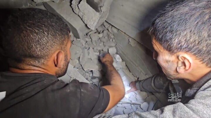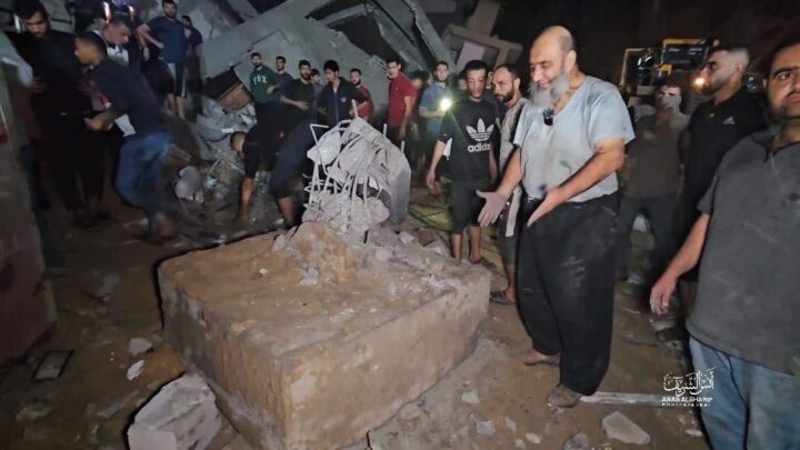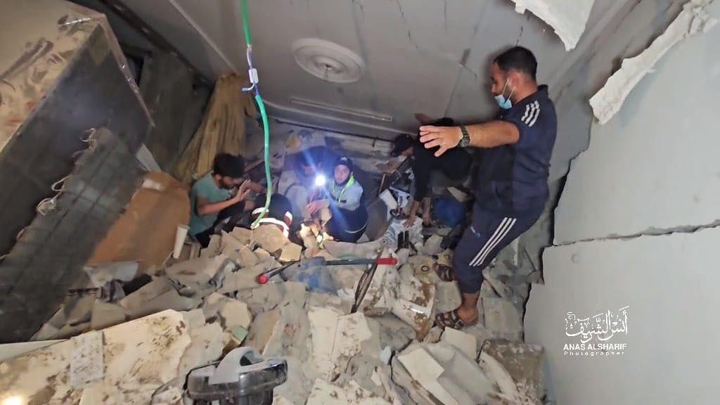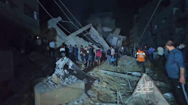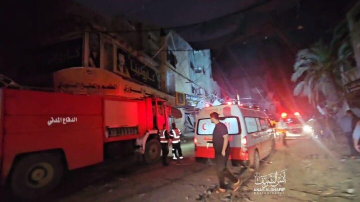 Morti e feriti in seguito all’attacco aereo che ha distrutto la casa della famiglia Jaber, vicino al nuovo mercato nel campo di Nuseirat, nel centro della Striscia di Gaza.