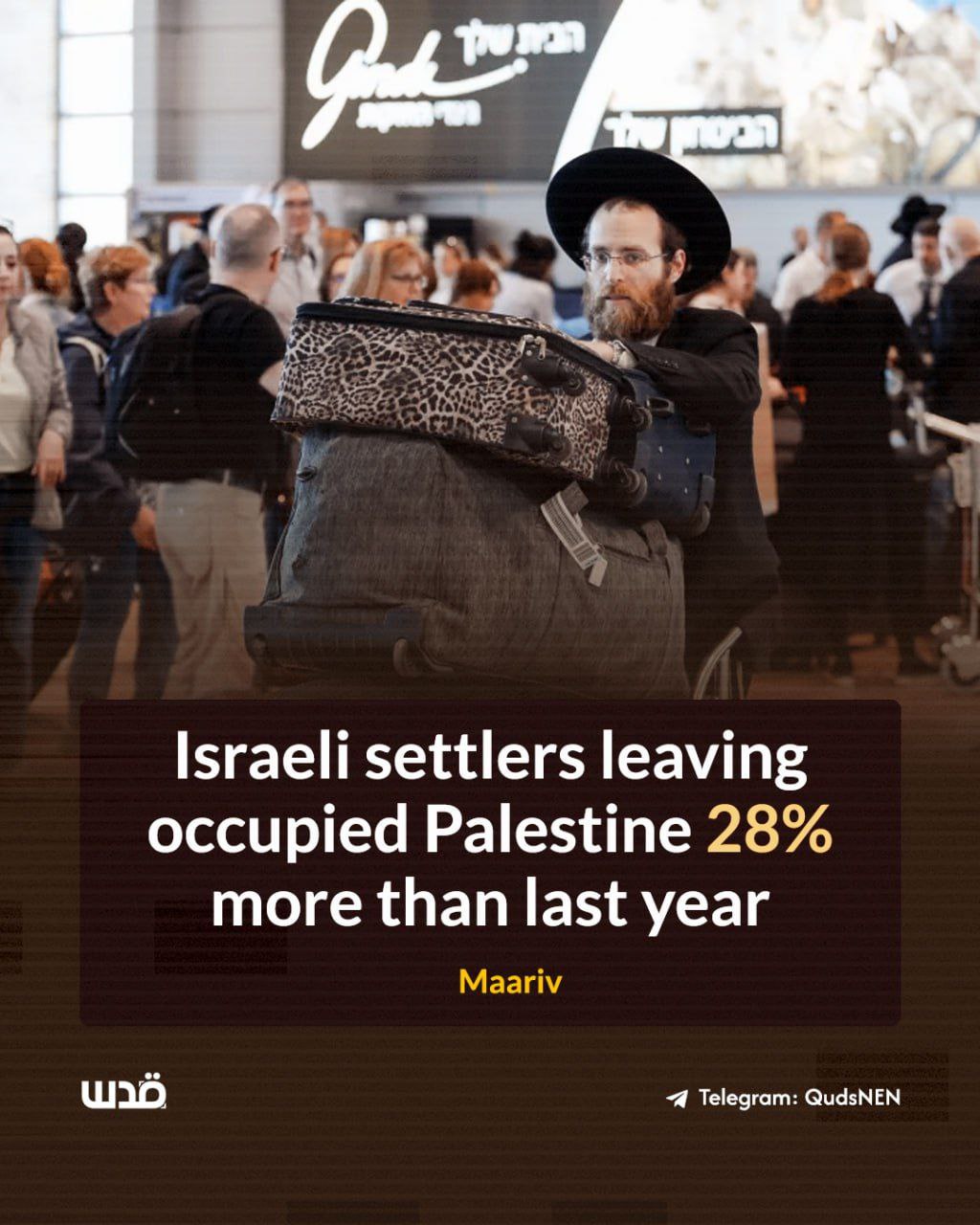 InfoPal. Il quotidiano israeliano Maariv riporta un notevole aumento dei coloni che lasciano la Palestina occupata, rivelando che il numero ha raggiunto quota 718.300, con un aumento del 28% rispetto allo scorso anno. Nonostante l’impennata dei prezzi dei biglietti, i coloni stanno partendo con compagnie aeree locali, poiché molte compagnie aeree straniere hanno sospeso i voli a causa della continua minaccia dei missili yemeniti.
