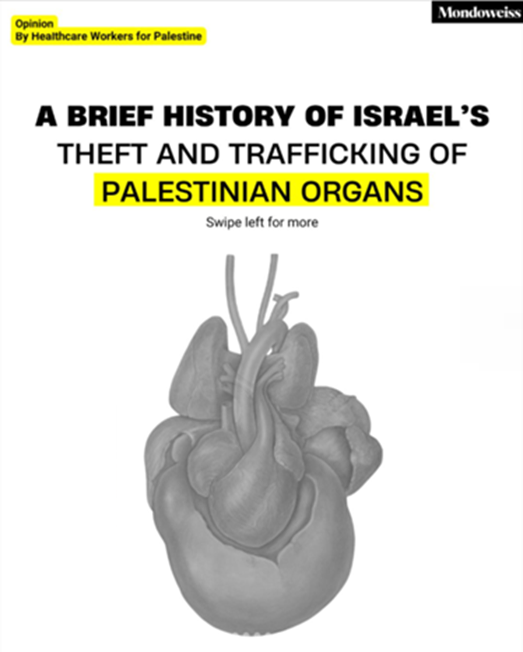 Em 2009, uma alta autoridade israelense, o professor Yehuda Hiss, ex-chefe médico do Instituto de Medicina Legal do Estado, admitiu em uma entrevista que, por anos e sem consentimento, seu instituto havia retirado órgãos de corpos de palestinos, mas também de israelenses e imigrantes.