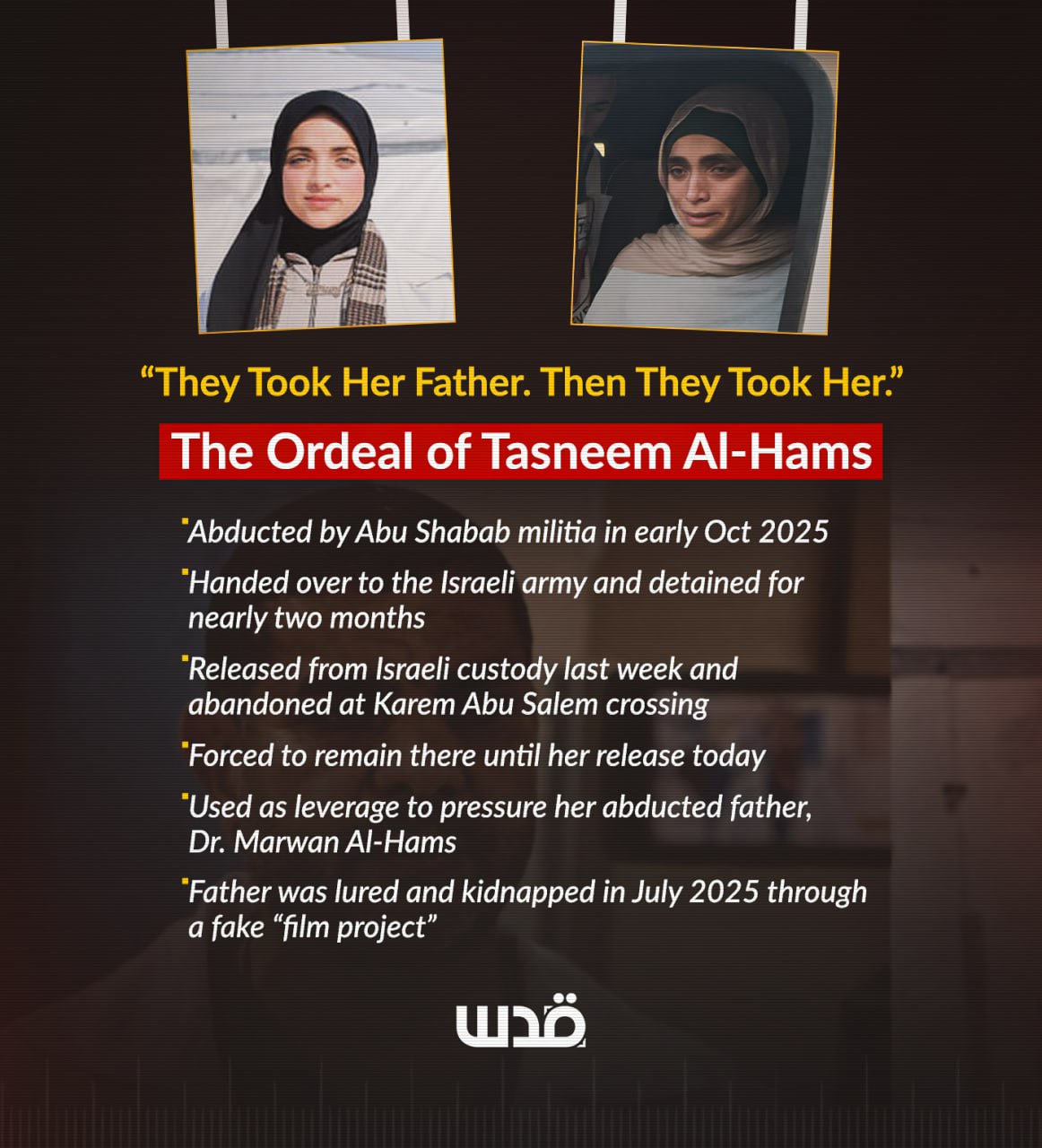 Gaza. Israel libertou a enfermeira Tasnim Al-Hams, filha do doutor Marwan Al-Hams, raptado pela quadrilha de Abu Shabab meses atrás. A enfermeira relata os detalhes de sua detenção e de sua transferência entre várias prisões para forçar o pai a confessar.