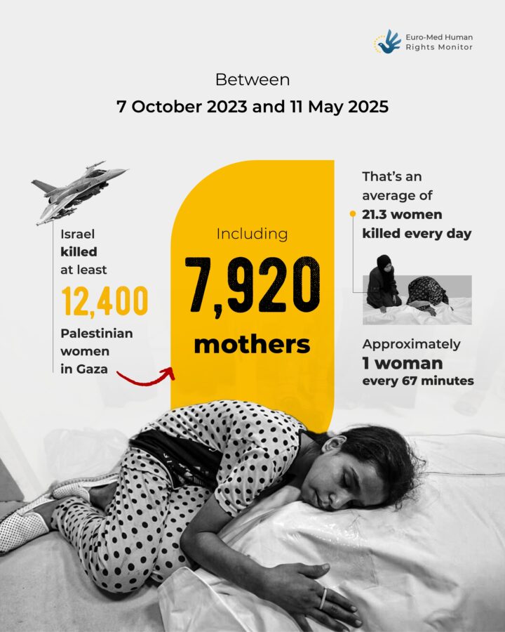 Euro-Med ha affermato che i dati raccolti sul campo rivelano un modello sistematico di uccisioni di donne incinte e giovani madri con i loro figli, o mentre cercano di prendersi cura e proteggere le loro famiglie, in flagrante violazione del diritto internazionale umanitario e come comportamento che minaccia direttamente il futuro della popolazione palestinese.