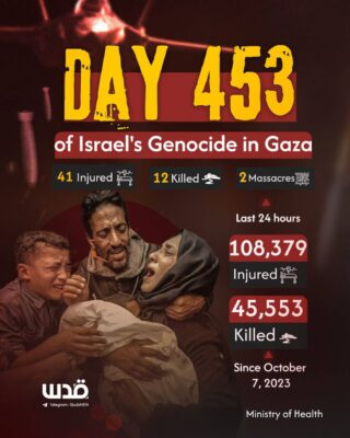 454° giorno di olocausto israelo-statunitense a Gaza. A dicembre, Israele ha lanciato 1.400 attacchi aerei, uccidendo 1.170 Palestinesi. Bilancio attuale: 45.553 morti accertati e 108.379 feriti
