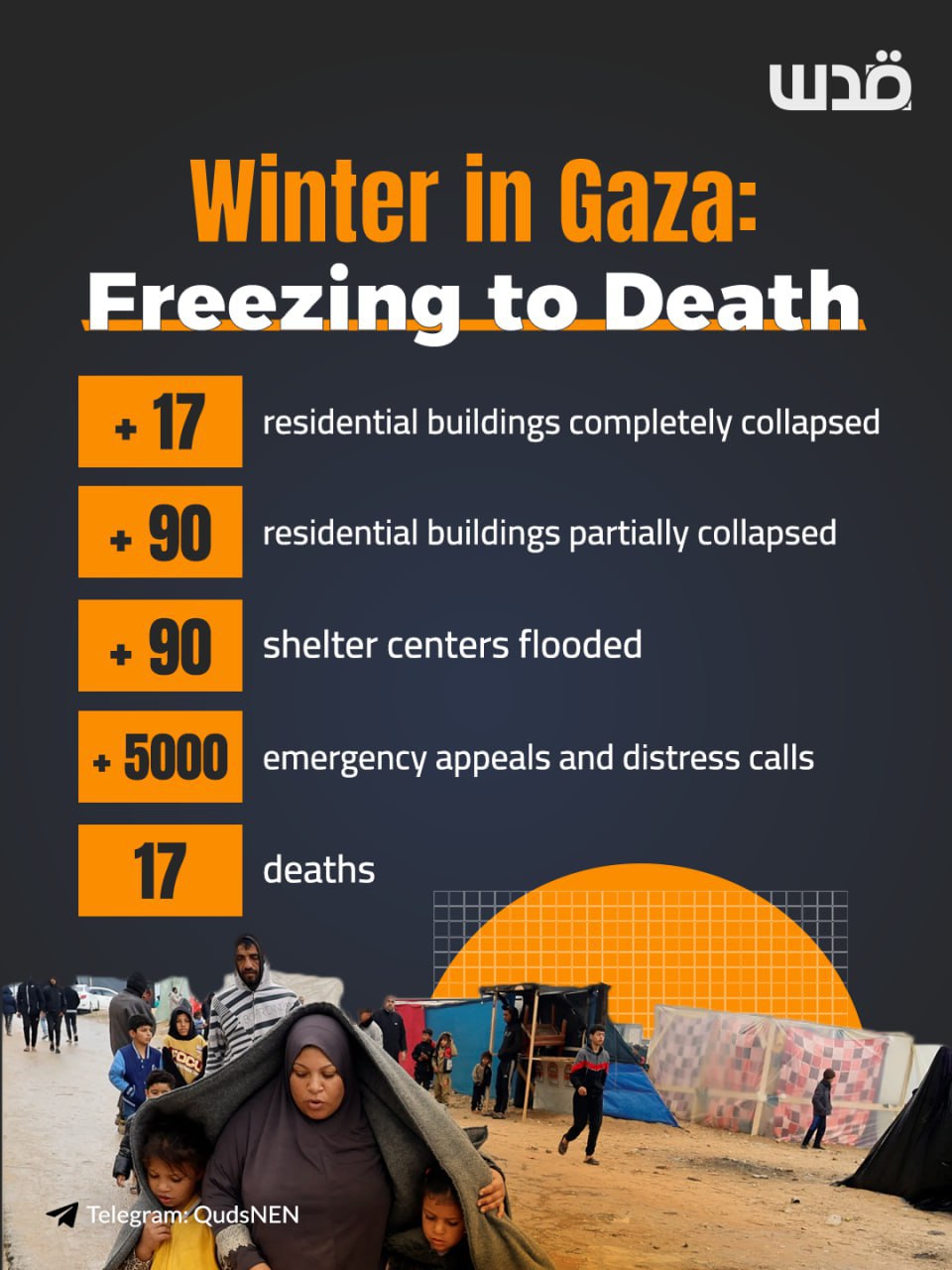 Explicou que as tendas, feitas de materiais plásticos e madeira, não conseguem resistir a chuvas intensas, frio e ventos fortes. Ao mesmo tempo, 90% da Faixa de Gaza foi destruída pelo genocídio israelense, e as casas restantes correm risco de desabamento, ameaçando a vida daqueles que nelas buscam abrigo.