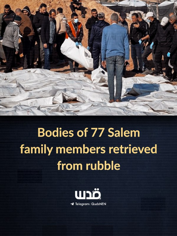 A Defesa Civil de Gaza anunciou a recuperação e a transferência de 77 corpos da família Salem debaixo dos escombros da casa de Abu Ramadan, destruída durante a guerra no bairro de Rimal, na parte ocidental da cidade de Gaza.