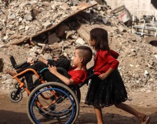 Questo è a causa di Israee. Una giovane ragazza palestinese spinge il fratello disabile in sedia a rotelle attraverso le
