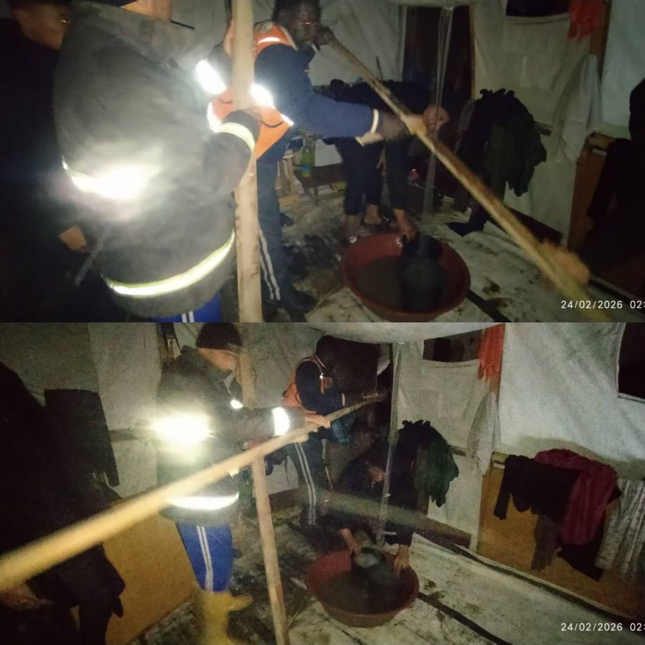 As equipes da Proteção Civil de Rafah receberam inúmeras chamadas de emergência durante a noite, após fortes chuvas terem alagado as tendas das famílias deslocadas.