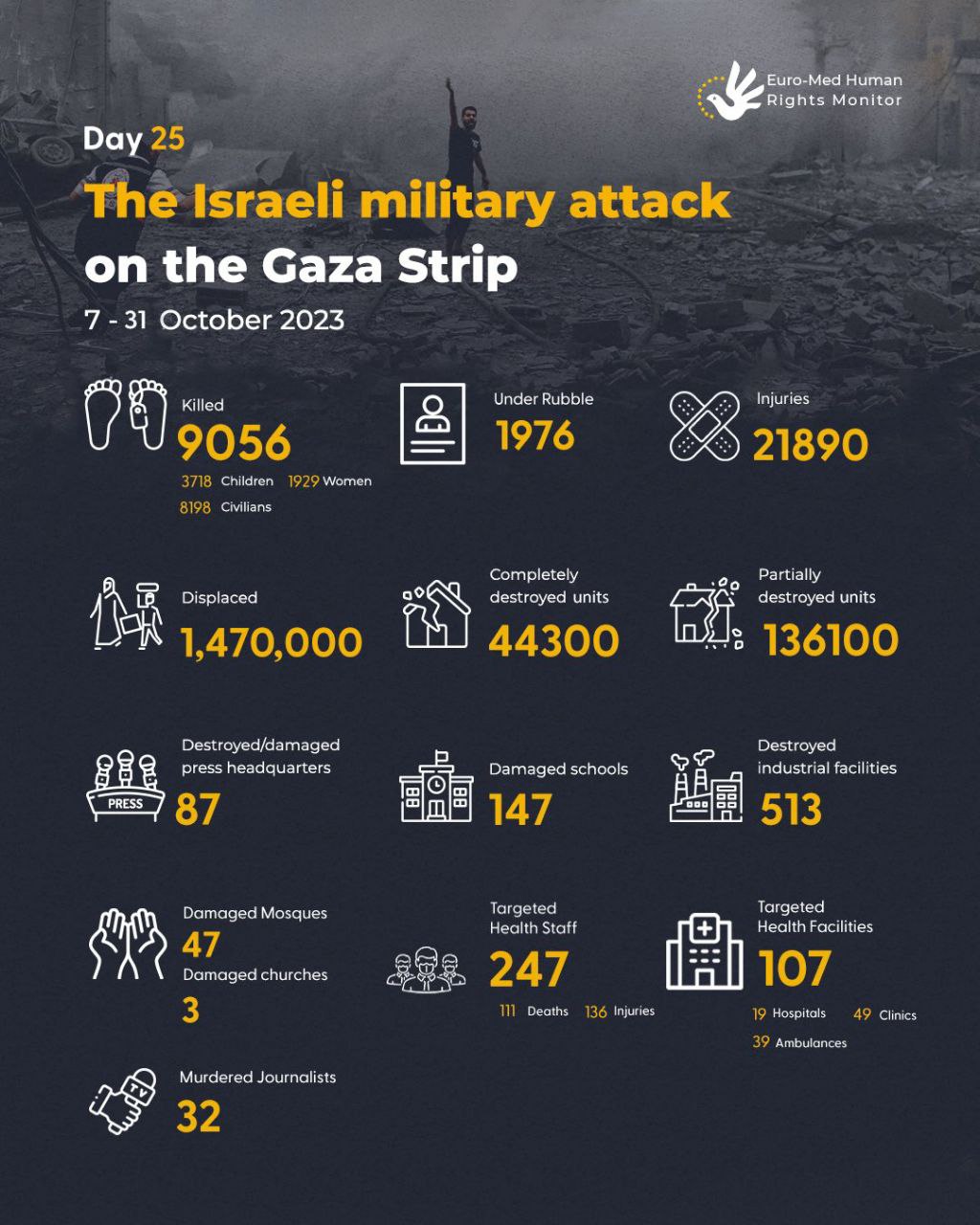 Secondo i dati forniti ieri sera dal ministero della Salute di Gaza, i morti solo oltre 9.000, circa 22.000 i feriti, e 1976 i dispersi sotto le macerie.