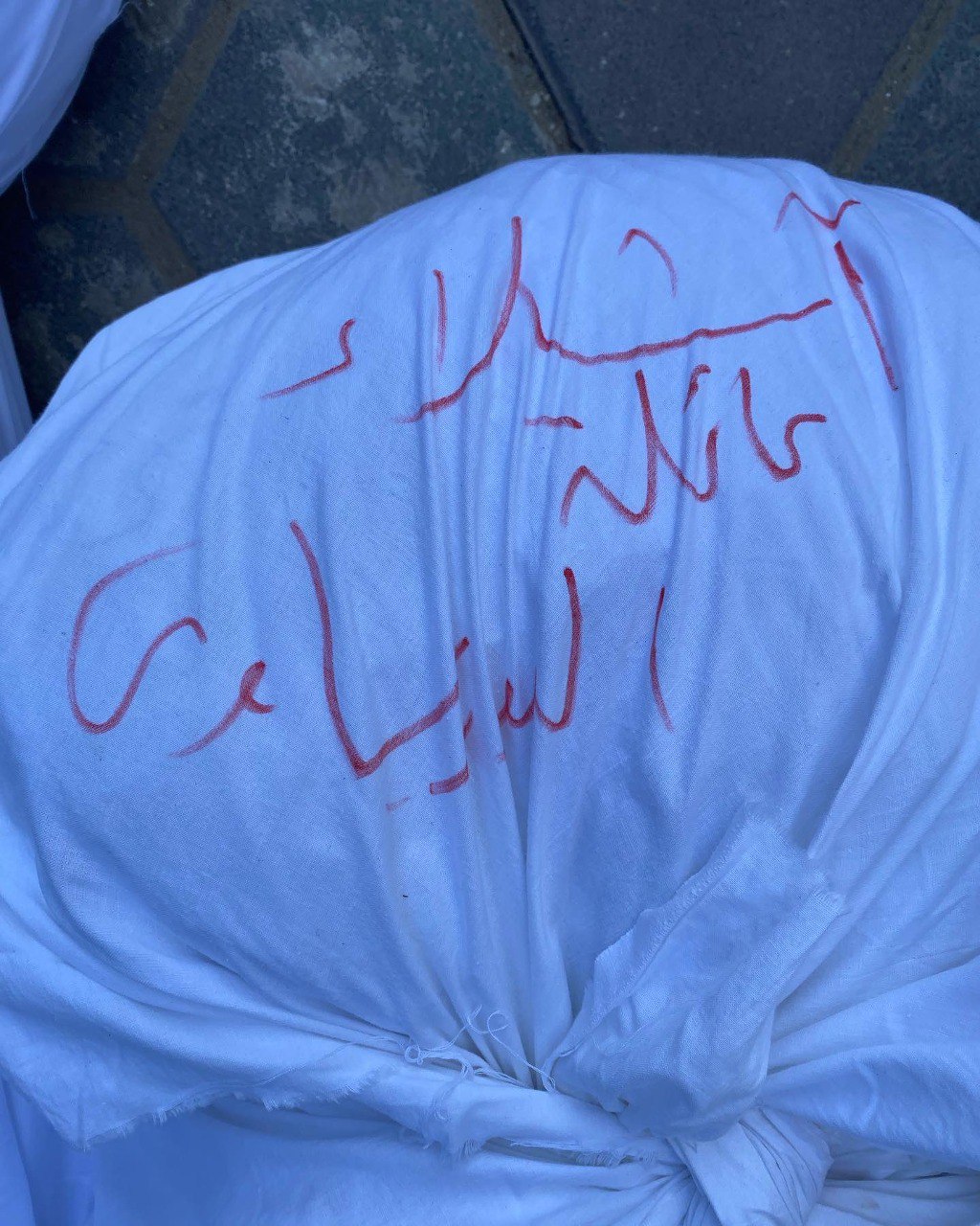Tutta la famiglia è stata annientata da Israele e da tonnellate di bombe di fabbricazione statunitense. Nel lenzuolo sono stati raccolti i pezzi della famiglia.