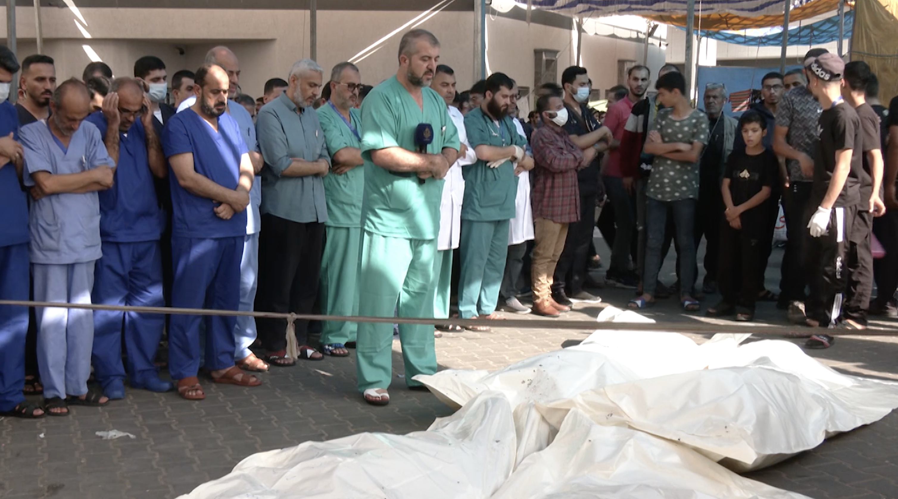 (Nella foto: personale medico del complesso di Al-Shifa esegue preghiere funebri per i due martiri, i dottori Abdullah e Hashem Al-Badri, uccisi da un bombardamento israeliano contro di loro e le loro famiglie nella città di Gaza).