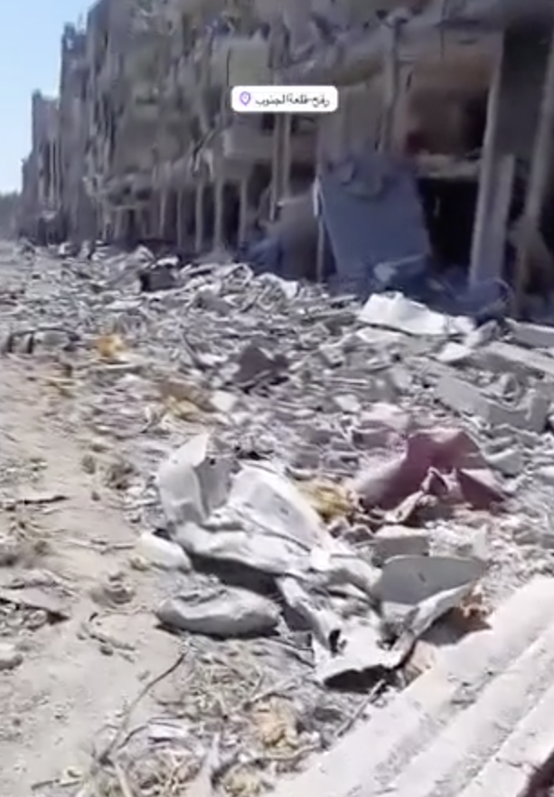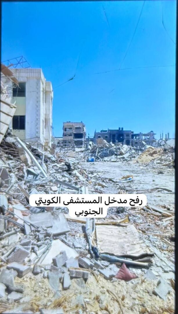 (Foto: distruzione nei pressi dell’ospedale specializzato del Kuwait, a Rafah, a seguito dell’attuale assalto militare israeliano).