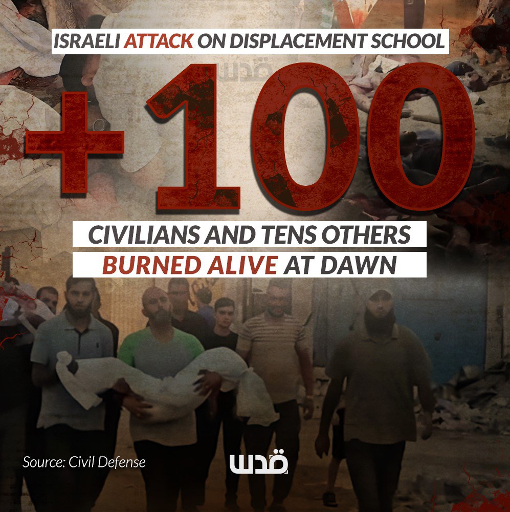 Questa mattina, sabato 10 agosto, oltre 100 civili sono stati uccisi e decine di altri sono rimasti feriti a seguito di un attacco aereo israeliano alla scuola At-Tabai’in, nel quartiere al-Daraj della città di Gaza.