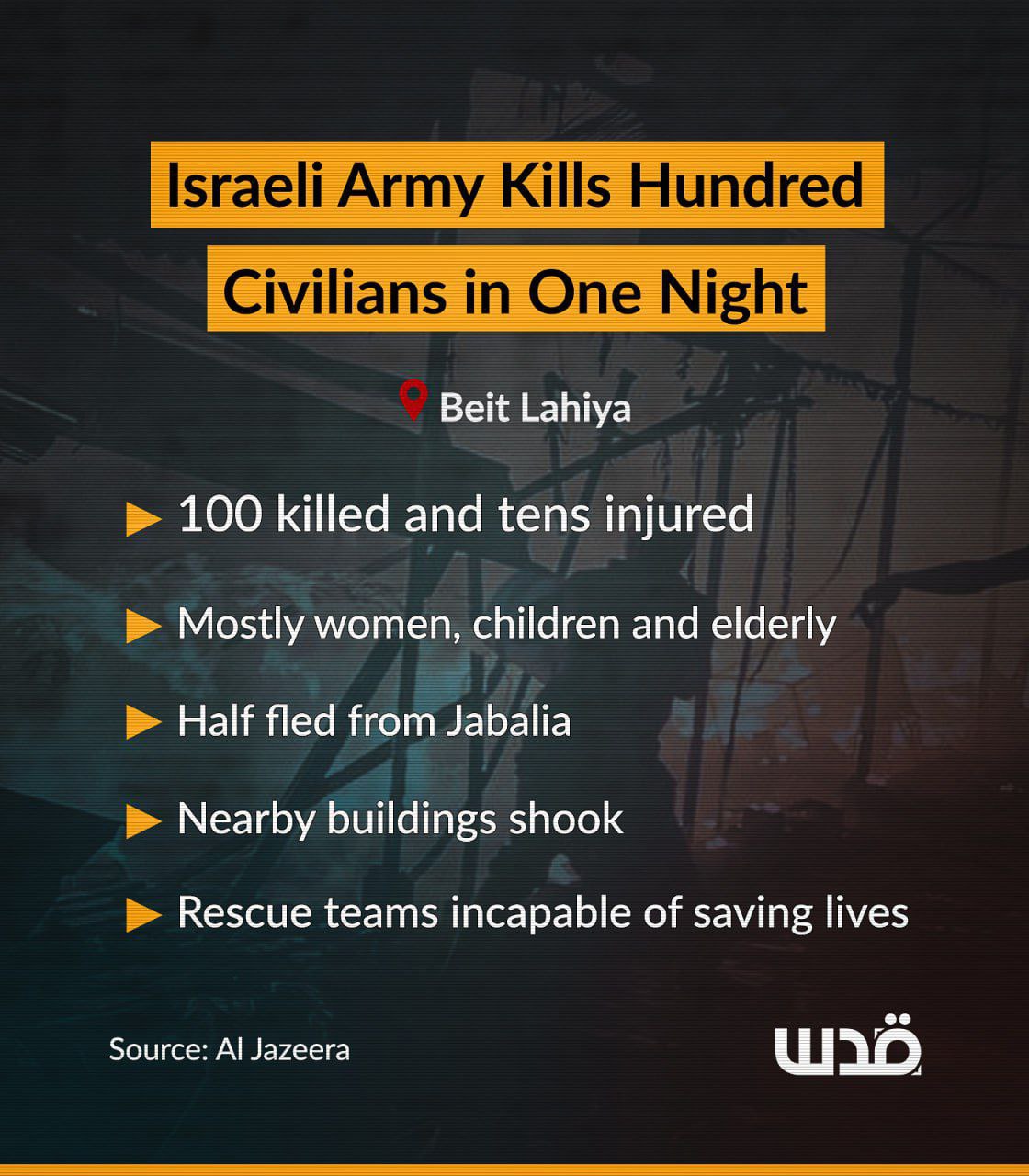 Sterminio in corso nel nord della Striscia di Gaza: oltre 73 palestinesi, tra cui molte donne e bambini, sono stati uccisi e decine sono rimasti feriti negli attacchi aerei israeliani di sabato sera che hanno colpito diverse case nella città di Beit Lahiya, nella Striscia di Gaza settentrionale.