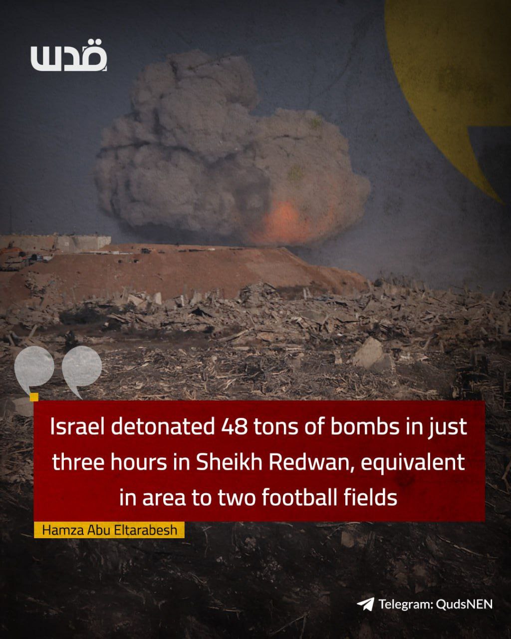 I residenti locali hanno riferito che l’esercito israeliano ha fatto esplodere sei robot carichi di tonnellate di esplosivo nel quartiere di Sheikh Radwan, uno ogni mezz’ora, ognuno dei quali trasportava circa otto tonnellate. Ciò significa che 48 tonnellate sono state fatte esplodere nell’arco di tre ore.
