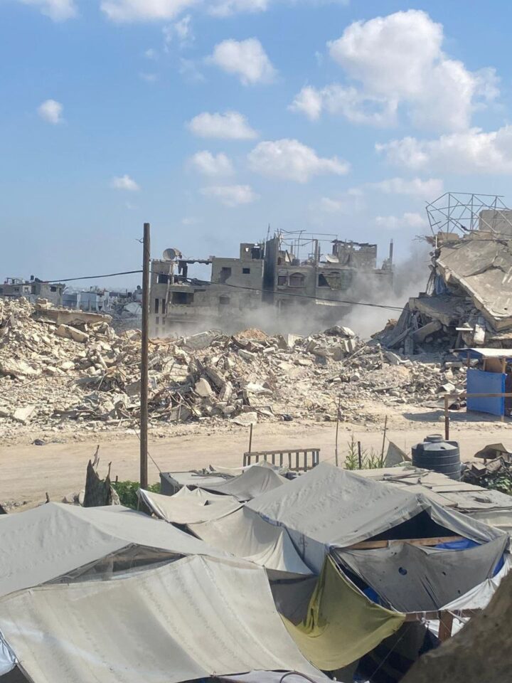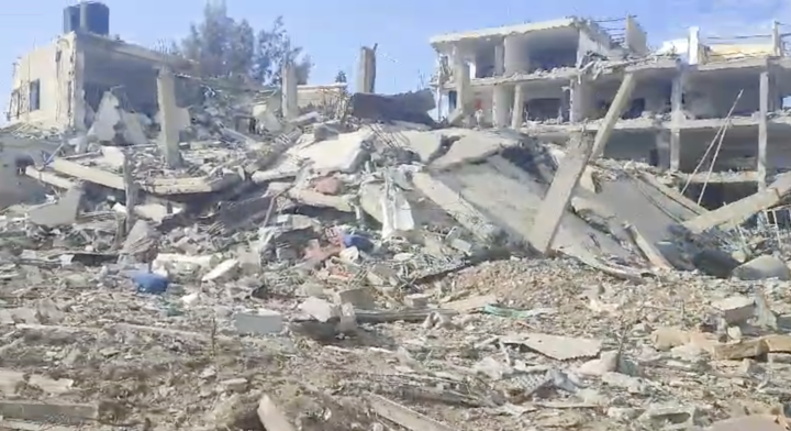 Distruzione di massa all’ingresso di Deir al-Balah, nella Striscia di Gaza centrale, in seguito al ritiro dei carri armati israeliani dall’area.