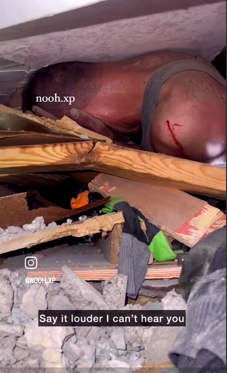 Un membro della Difesa civile palestinese documenta l’operazione di salvataggio di un padre palestinese e di sua figlia da sotto le macerie della loro casa, in seguito a un attacco aereo israeliano a Gaza.