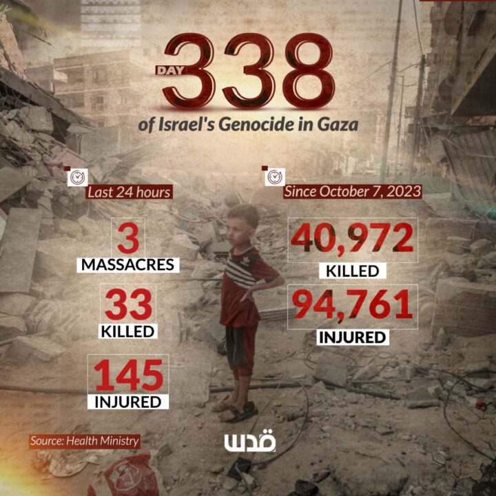 Gaza – InfoPal. Le forze di occupazione israeliane, sostenute e armate dagli Stati Uniti e dall’Europa, continuano la loro guerra coloniale genocida nella Striscia di Gaza per il 338° giorno consecutivo, aggiungendo crimini su crimini, nell’impunità totale e con l’aiuto della vergognosa e immorale disinformazione dei media egemonici.