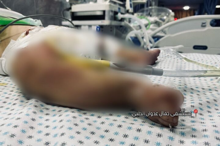 Questo bambino ha perso tre dei suoi quattro arti a causa degli attacchi aerei indiscriminati di Israele nel nord di Gaza.