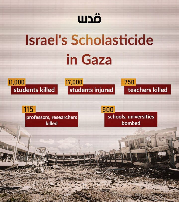 11.000 studenti uccisi, 17.000 feriti; 750 insegnanti e 115 tra docenti e ricercatori uccisi; 500 scuole, università bombardate.