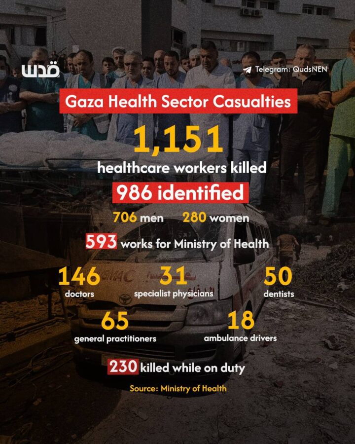 L’ultimo bilancio del ministero della Salute di Gaza riporta il numero di operatori sanitari uccisi dall’inizio del genocidio israeliano in corso nella Striscia di Gaza: 1.151, di cui 146 medici, 31 specialisti, 50 dentisti, 65 di medicina generale, 18 autisti di ambulanza. 230 sono stati uccisi mentre erano in servizio.