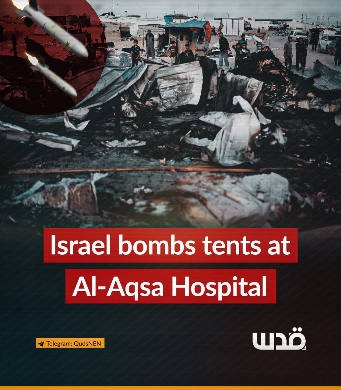 Fonti mediche hanno confermato che un giovane è stato ucciso e altri hanno riportato ferite a seguito dei bombardamenti israeliani che hanno preso di mira le tende degli sfollati all’ospedale dei martiri di Al-Aqsa, a Deir al-Balah, situato nella parte centrale di Gaza (si vedano foto di copertina e il video qui sotto).