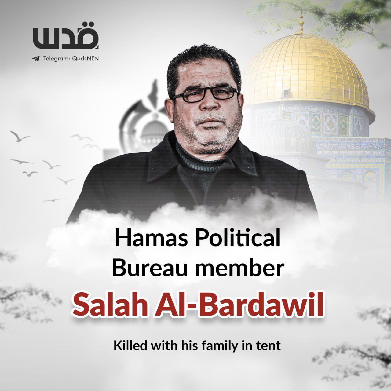 Hamas ha annunciato ufficialmente il martirio del membro dell’Ufficio politico e del Consiglio legislativo palestinese, il dott. Salah al-Bardawil, insieme a sua moglie Hanan, presi di mira in un attacco aereo mentre stavano eseguendo le preghiere della notte del Ramadan nella loro tenda, a Khan Yunis.