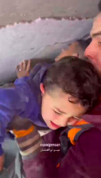 Le squadre della Protezione civile hanno salvato i bambini da sotto le macerie della casa della famiglia Awad nel quartiere Al-Zaytoun di Gaza, bombardata dalle forze di occupazione israeliane.