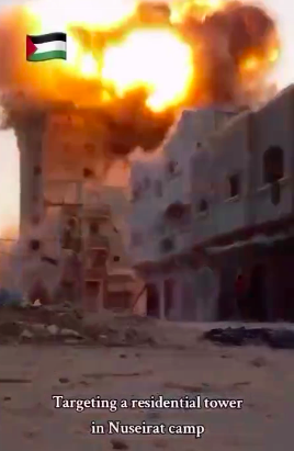 Riprese che documentano il momento in cui un attacco aereo israeliano ha colpito un edificio residenziale nel campo profughi di Nuseirat, nella zona centrale di Gaza, all’inizio di questa settimana.