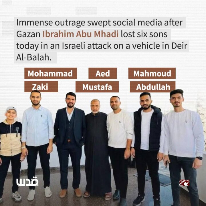 Il padre palestinese Ibrahim Abu Mhadi ha recitato la preghiera funebre sui corpi dei suoi sei figli, uccisi in un attacco aereo israeliano contro un’auto civile a ovest di Deir Al-Balah.