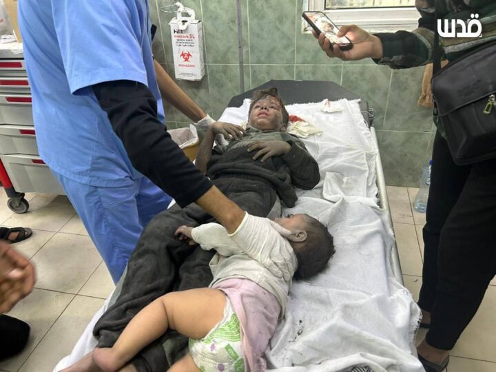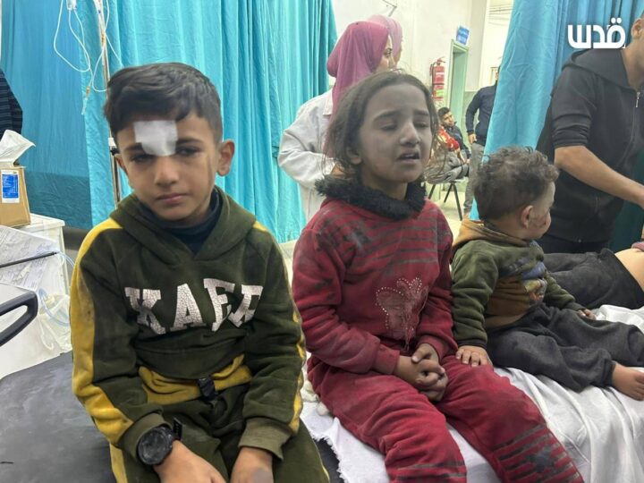 (Bambini feriti tra i civili innocenti in seguito al bombardamento da parte dell’occupazione israeliana di una casa della famiglia Al-Hams nel campo profughi di Yabna a Rafah, nel sud della Striscia di Gaza).
