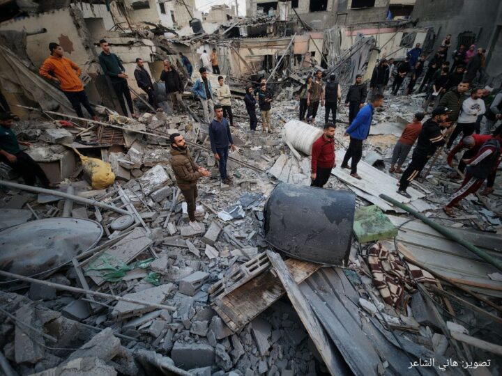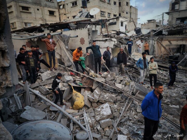 Gli aerei d’occupazione hanno distrutto l’edificio Al-Qadi in strada Al-Ternis nel campo profughi di Jabalya, nel nord della Striscia di Gaza.