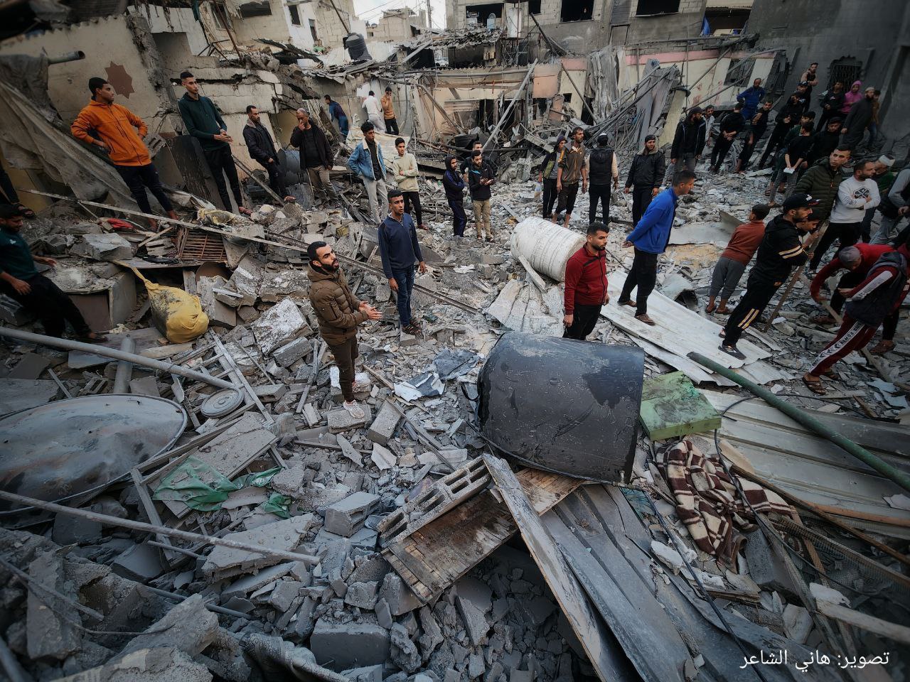 Foto che documentano la massiccia distruzione provocata dagli attacchi aerei israeliani su Rafah, a sud della Striscia di Gaza, questa mattina.