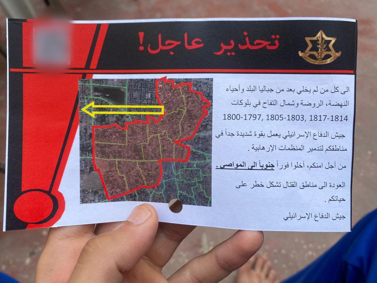 Questa mattina l’esercito di occupazione israeliano ha distribuito volantini intimando ai residenti di alcune zone di Jabalia, nel nord della Striscia di Gaza, di abbandonare immediatamente le proprie case e di dirigersi verso sud, nell’ultimo ordine di sfollamento forzato emesso dall’esercito israeliano durante il genocidio in corso a Gaza.