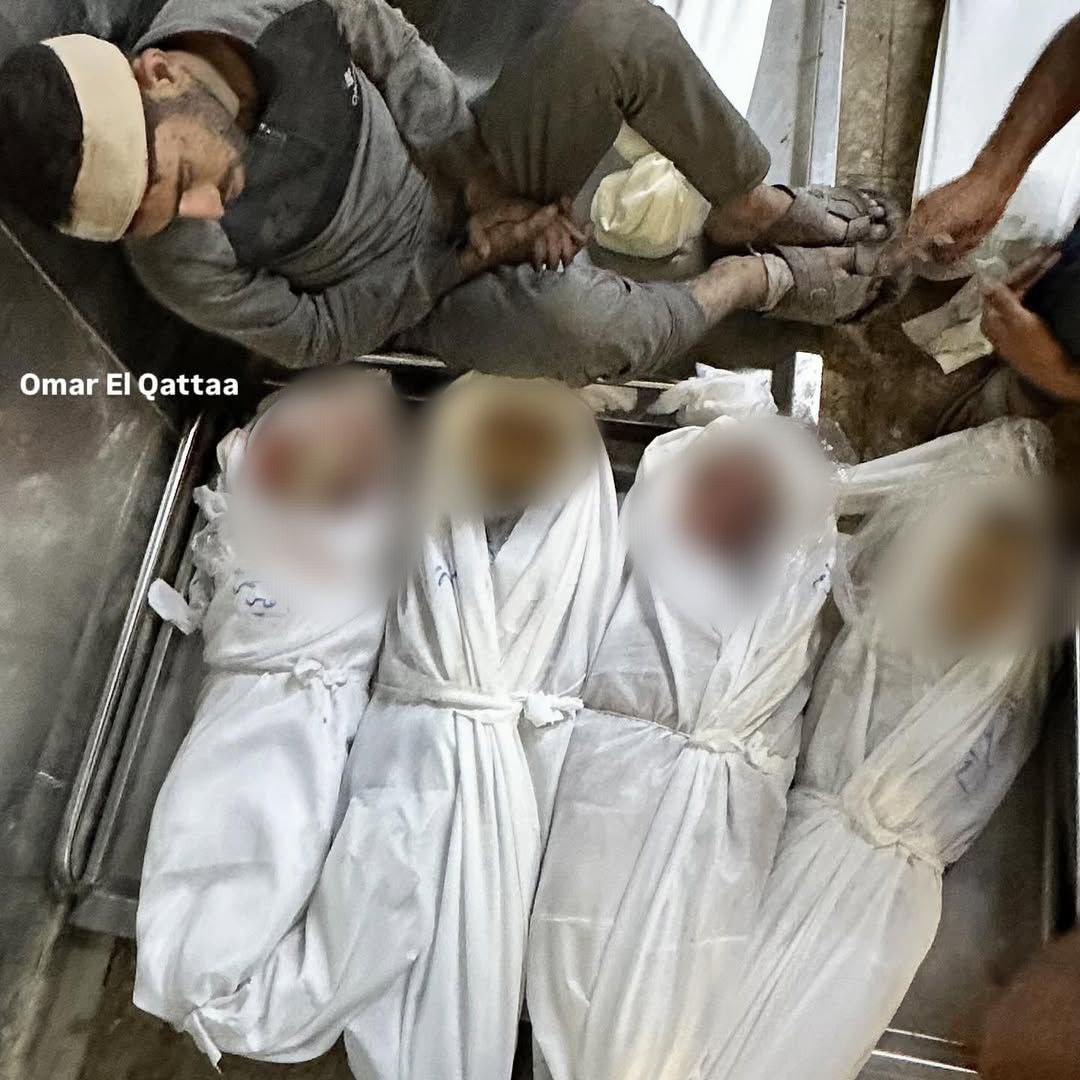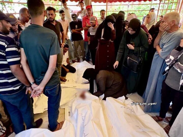 Scene strazianti del funerale di Nasser Abu Jarad, di sua moglie Yasmin e dei loro figli Nasser, Ghassan, Waseem e Rimas, tutti uccisi questa mattina in un attacco aereo israeliano sulla loro tenda per sfollati nella città di Gaza.
