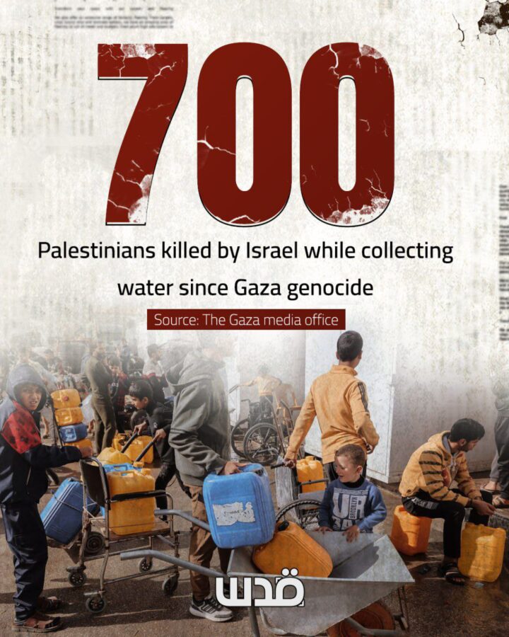 Secondo l’Ufficio Stampa del governo di Gaza (GMO), oltre 700 palestinesi, la maggior parte dei quali bambini, sono stati uccisi in attacchi aerei israeliani mentre raccoglievano acqua per le loro famiglie dall’inizio dell’offensiva israeliana in corso su Gaza.