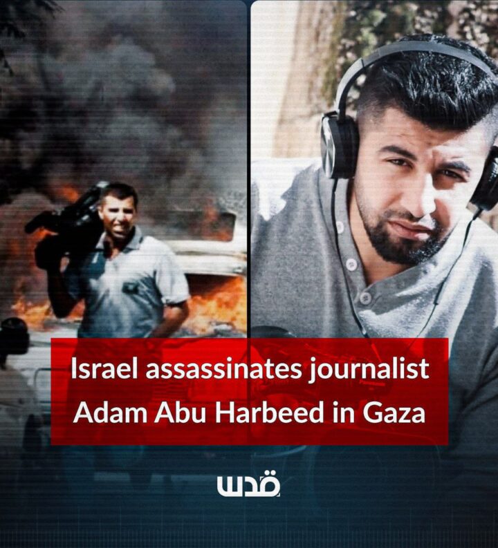 Il giornalista palestinese Adam Abu Harbeed è stato ucciso ieri sera in un attacco aereo israeliano che ha preso di mira la sua tenda, ferendo gravemente la moglie e i figli.