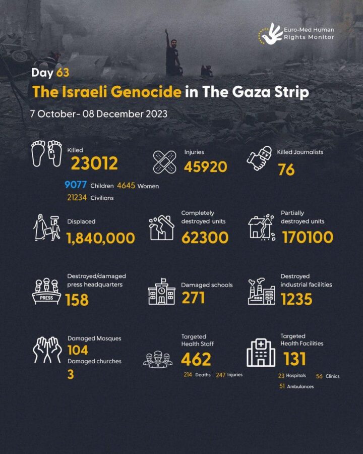 L’esercito di occupazione israeliano bombarda Gaza dall’aria, dal mare e dalla terra e impone uno stretto assedio alla popolazione da molte settimane. Vaste aree del territorio sono ridotte a una landa desolata. L’ONU afferma che circa l’80% della popolazione è stata sfollata, affrontando carenza di cibo, carburante, acqua e medicine, insieme alla minaccia di malattie e carestia.