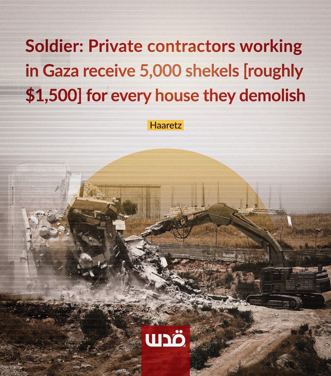 Haaretz ha pubblicato un nuovo rapporto sul lavoro dei soldati israeliani presso il GHG a Gaza. Un soldato veterano ha rivelato che qualsiasi appaltatore privato che lavori a Gaza con attrezzature ingegneristiche riceve 5.000 shekel [circa 1.500 dollari] per ogni casa demolita, aggiungendo che stanno guadagnando una fortuna e che ogni momento in cui non demoliscono case è una perdita di denaro.