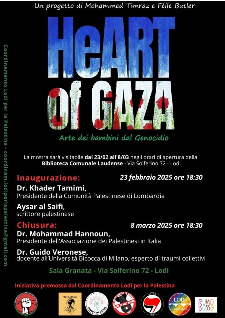 Nella stessa sala avevamo svolto la conferenza  con il Presidente della Comunità Palestinese di Lombardia, molto partecipata, come apertura della mostra “HeART of Gaza”, progetto che nei mesi si è trasformato in un’iniziativa globale, capace di portare all’attenzione del mondo la realtà quotidiana dei più vulnerabili, i bambini e che trasmette le emozioni, i traumi e le loro paure, provocati da oltre quindici mesi di catastrofe sociale, umanitaria e sanitaria della Striscia di Gaza.