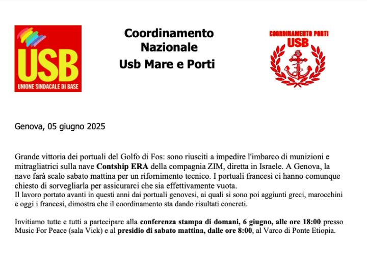 Il lavoro portato avanti in questi anni dai portuali genovesi, ai quali si sono poi aggiunti greci, marocchini e oggi i francesi, dimostra che il coordinamento sta dando risultati concreti.Il presidio inizialmente previsto per le 15:00 di venerdì è sospeso: invitiamo tutte e tutti a partecipare alla conferenza stampa venerdì 6 giugno, alle ore 18:00 presso Music For Peace (sala Vick) e al presidio di sabato mattina, dalle ore 8:00, al Varco di Ponte Etiopia.