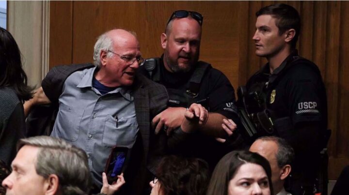 La polizia ha trascinato Cohen e altri manifestanti fuori dall’aula. Un agente di polizia di Capitol Hill ha afferrato Cohen per un braccio, quasi facendogli perdere l’equilibrio, e lo ha trascinato fuori dall’udienza del Senato.